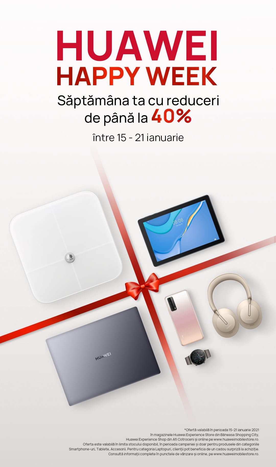 Campania Huawei Happy Week se desfășoară atât în magazinele Huawei Experience Store din Afi Cotroceni și Huawei Experience Store din Băneasa Shopping City, cât și online, pe aici. Ofertele speciale din cadrul campaniei lunare Huawei Happy Week sunt concepute pentru a le oferi utilizatorilor cel mai bun raport calitate-preț al dispozitivelor care îi ajută să rămână conectați cu toate lucrurile importante: activitățile profesionale și de divertisment, dar și cu pasiunile și starea sănătății lor.