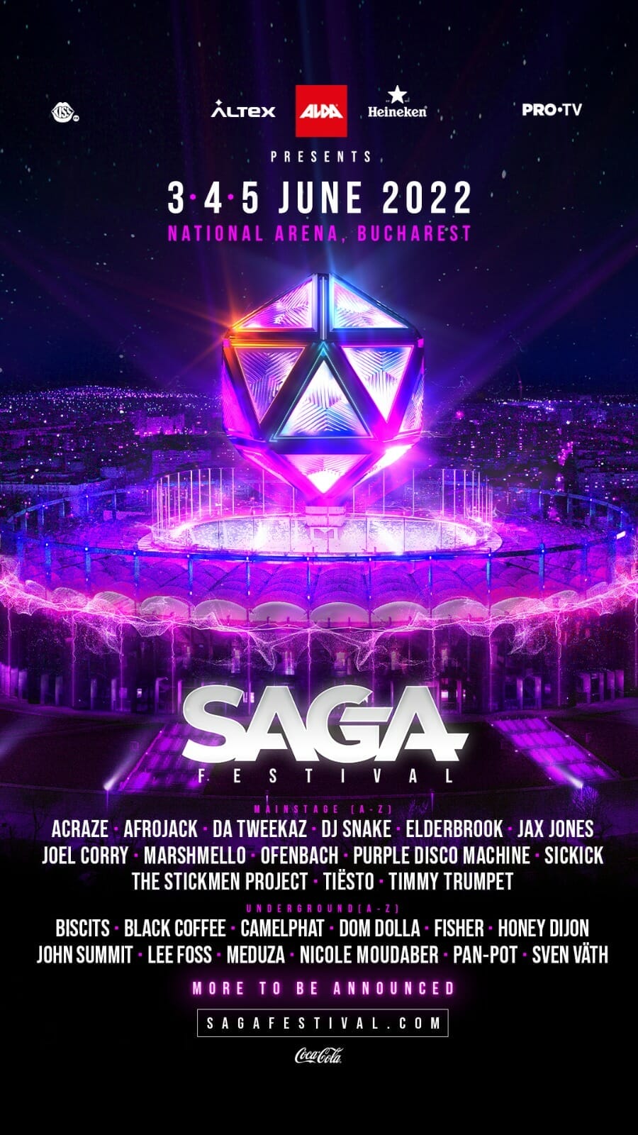 Afrojack, Black Coffee, DJ Snake, Fisher, Marshmello, Meduza, Nicole Moudaber, Ofenbach, Pan-Pot, Purple Disco Machine, Sickick, Sven Vath, Tiësto, Timmy Trumpet, The Stickmen Project, Elderbrook, Acraze, Jax Jones, Camelphat, Joel Corry, Da Tweekaz, Honey Dijon, Dom Dolla, Biscits, John Summit, Lee Foss vor aduce energia și efervescența pe scenele SAGA Festival în iunie. Alte nume mari vor completa line-up-ul și vor fi anunțate în perioada următoare.