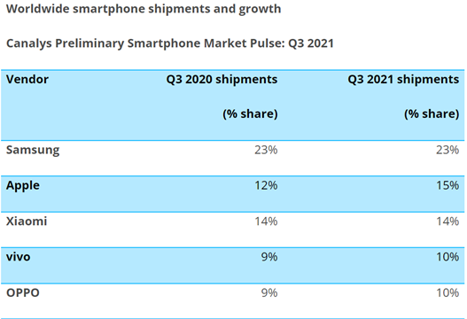 vivo s-a clasat pe locul patru în livrările globale de smartphone-uri în trimestrul 3 din 2021, potrivit Canalys