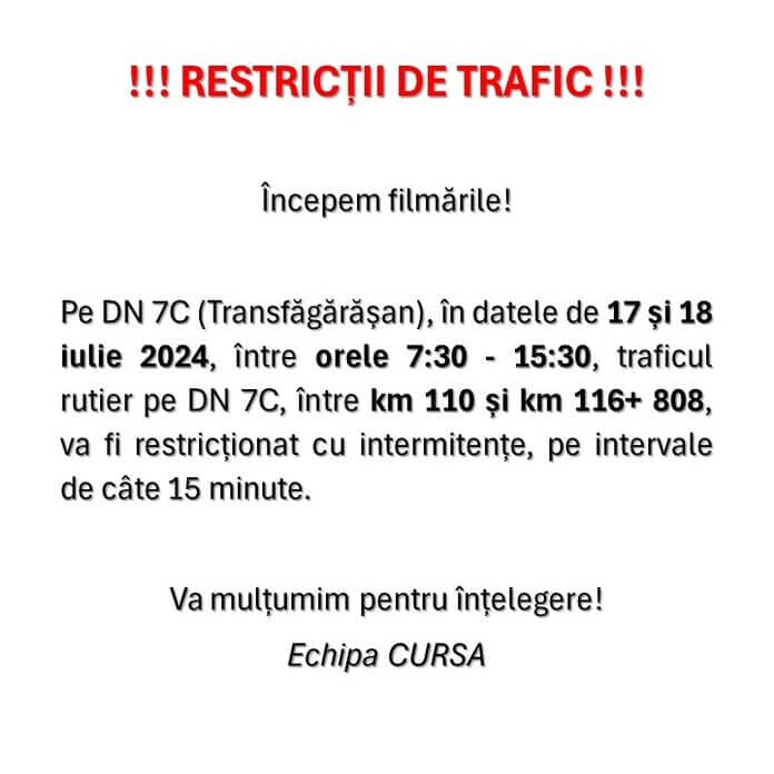 O parte din secvențe se vor filma pe DN 7C ( Transfăgărășan). În acest sens, în zilele de 17 și 18 iulie 2024, între orele 7:30 – 15:30 , traficul rutier pe DN 7C , între km 110 și km 116+ 808, va fi restricționat cu intermitențe, pe intervale de câte 15 minute.