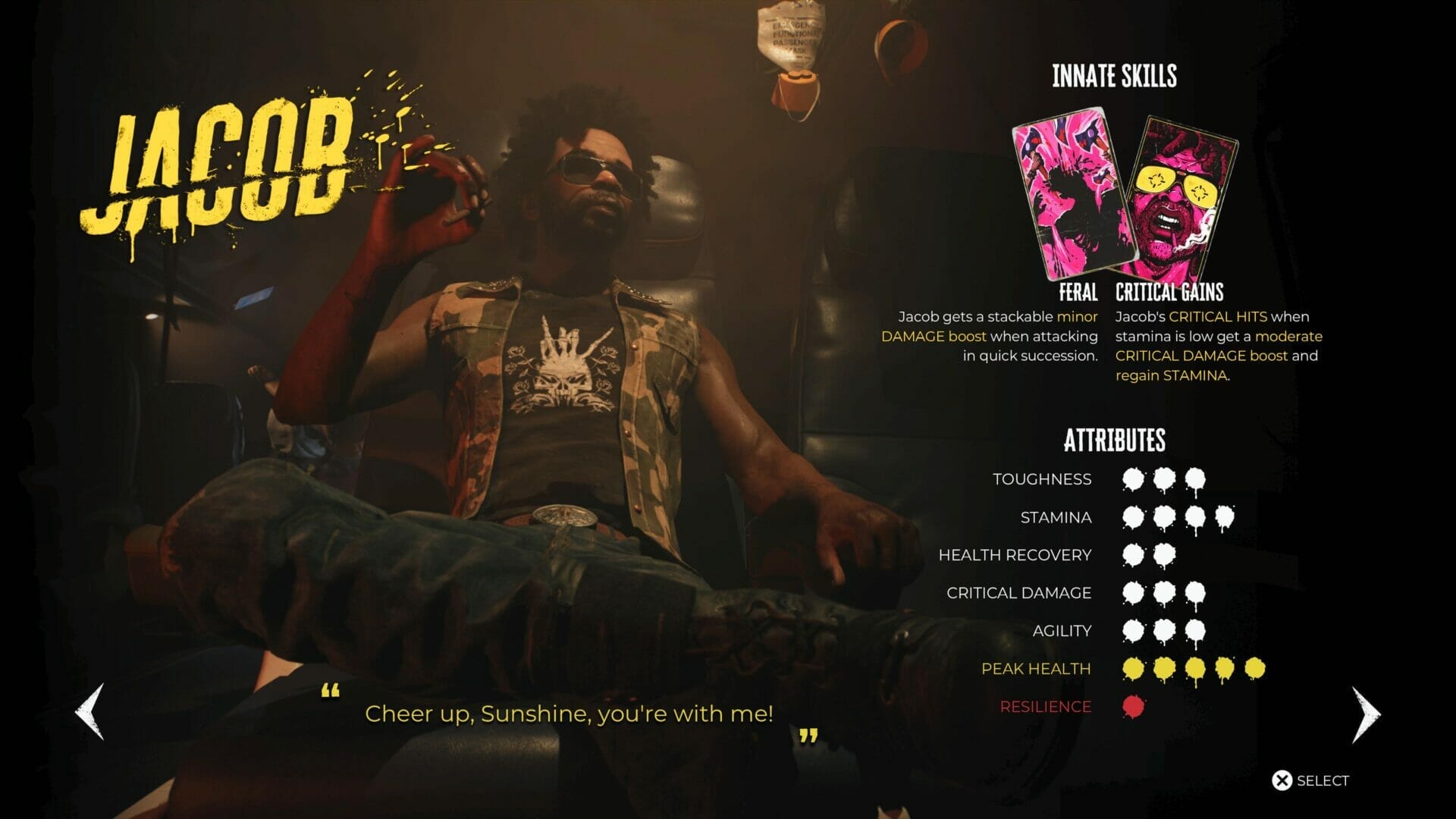 Jacob – Îți oferă un aer de rockstar și parcă semănă foarte mult cu Lenny Kravitz. Acesta și-a urmat visul de a devenii un cascador la Hollywood dar hoardele de Zombie nu l-au lăsat să își îndeplinească visul.