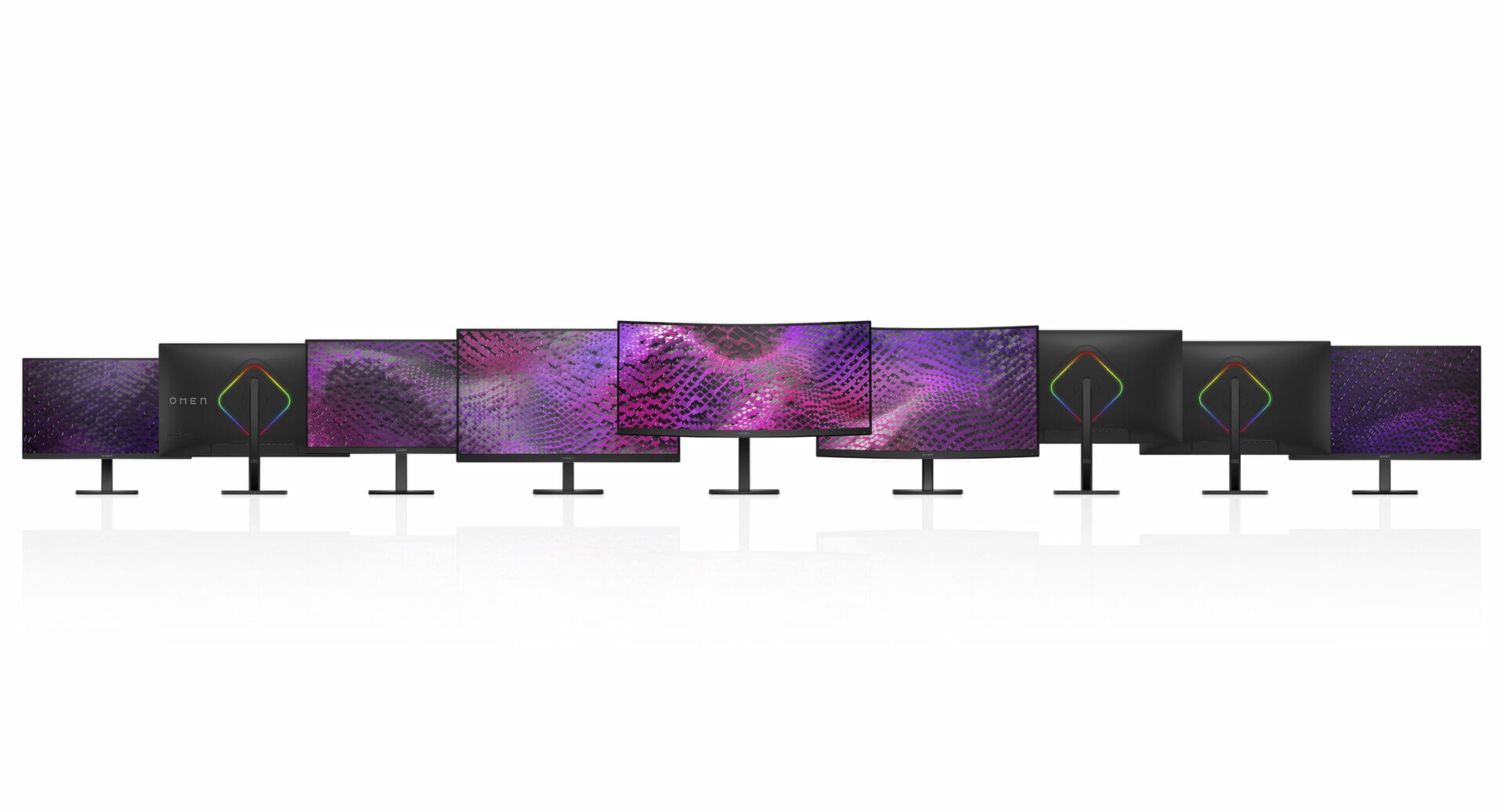 Monitoarele de gaming OMEN 24, OMEN 27, OMEN 27q, OMEN 32q și OMEN 32c au toate rată de refresh standard în industrie de 165 Hz8 și conectivitate plug and play[xiv]. OMEN 27s și OMEN 27qs au aceleași caracteristici, dar cu o rată de refresh de până la 240Hz8. OMEN 34c oferă un ecran curbat 1500r cu un raport 21:98.