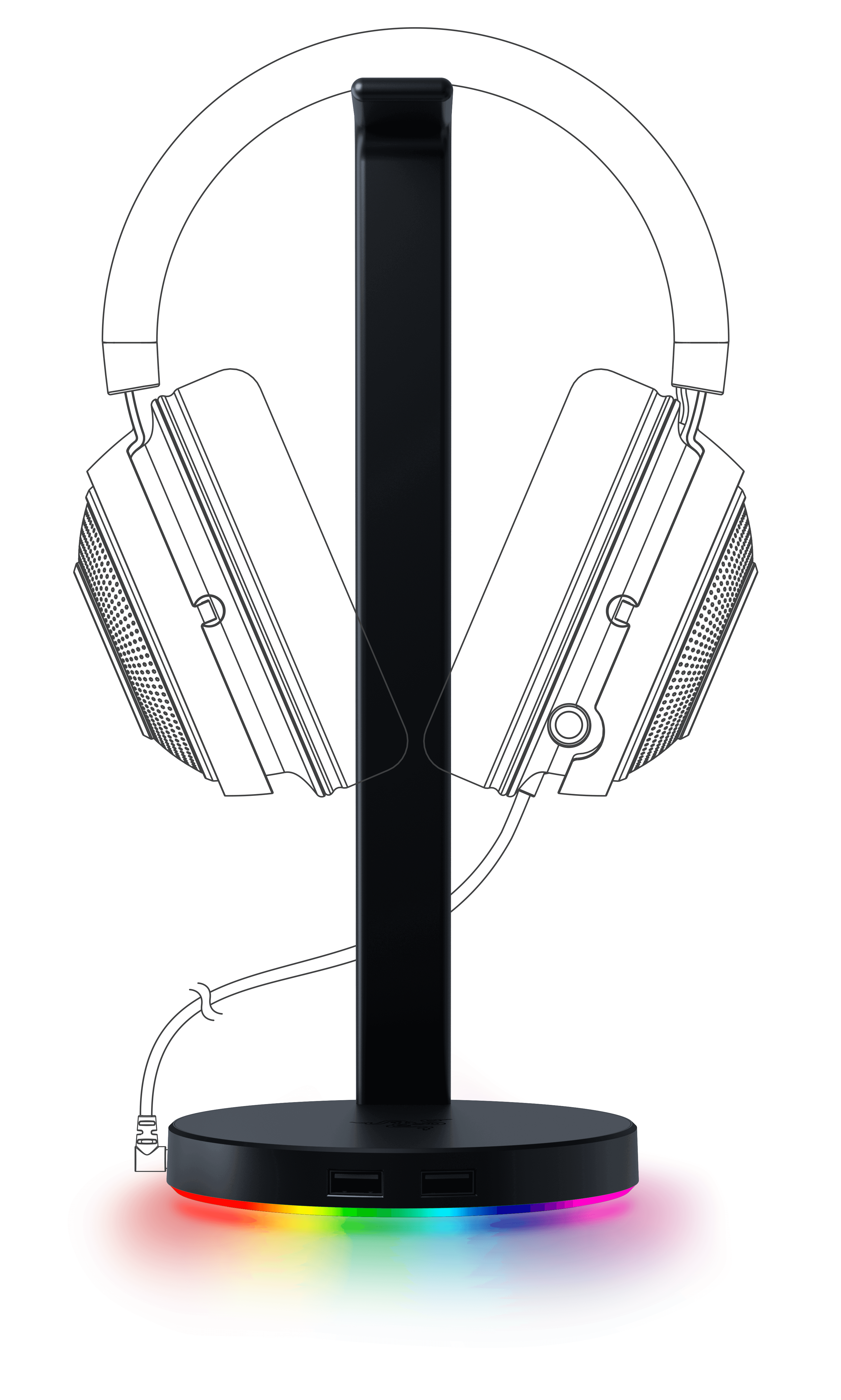 - Razer Base Station V2 Chroma: Noul stand de căști a fost conceput să fie mai puțin intruziv, mai fiabil și mai versatil. Astfel, noul stand are un design simplificat, mai îngust, fiind confecționat din aluminiu. Se remarcă baza care previne alunecarea și care include și sistemul de iluminare Chroma RGB. Noul Base Station V2 Chroma elimină risipa de spațiu, prezentând în partea de jos o selecție de porturi, inclusiv două porturi USB 3.1 și un port combo de 3.5mm cu DAC încorporat, făcând astfel posibilă redarea audio 7.1. Standul va fi disponibil pe negru, pe Quartz și pe Mercury.