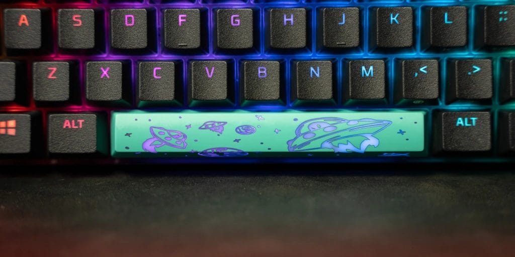 În pachet avem parte de tastatura propriu zisă, ce vine cu un cablu de conectare USB A la USB-C. Faptul că mai oferă un keycap puller este un plus deoarece ne ajută să curățăm tastatura mult mai simplu, în plus vine și cu două taste respectiv un spacebar și o altă tastă ce o putem utiliza după bunul plac, aceste două taste sunt de culoare albastru deschis cu, câteva planete desenate și logo-ul HyperX pe spacebar. Sunt o adiție plăcută și sunt sigur că va încânta fiecare cumpărător.