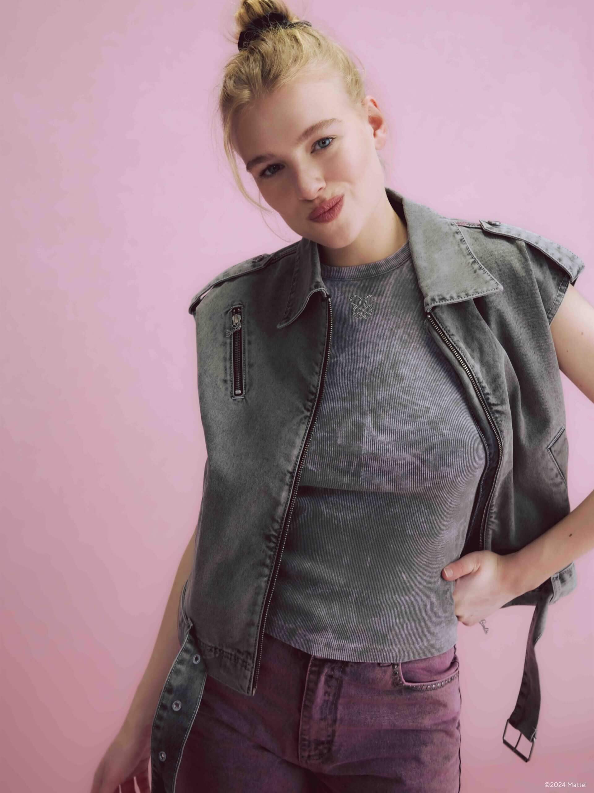 Contrar celor asociate automat cu Barbie, rozul apare aici alături de lila, bleu și gri. Aspectul grunge îndulcit e amplificat de efecte de tocit, umbrit, brodat decorativ și aplicații strălucitoare, în contrast cu fundalul mat și aspru.