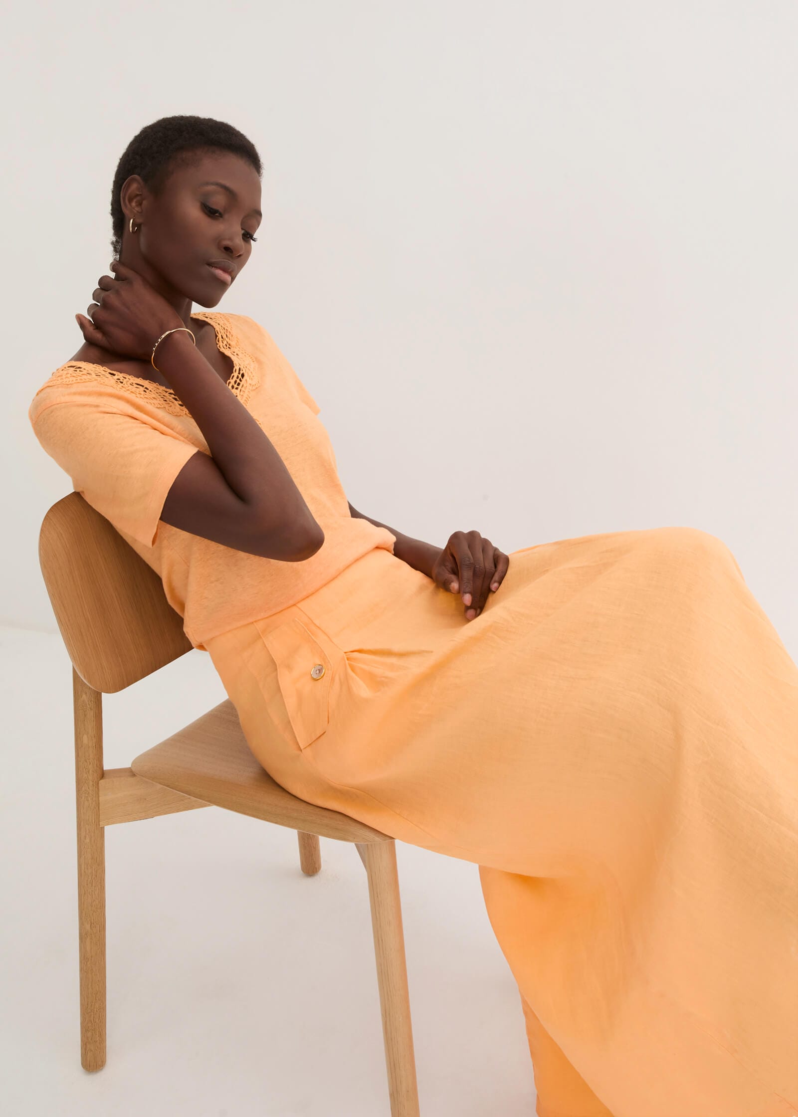 Linia Premium nu duce lipsă de accente subtile de culoare. Pe lângă nuanțele clasice și atemporale, vei găsi culoarea pastelată la modă Peach Fuzz și verdele proaspăt de limetă. Ambele culori se potrivesc bine cu albul sau bejul, creând un ansamblu armonios. Arată la fel de bine într-un total look – asortează o fustă maxi din in portocaliu cu un tricou în aceeași nuanță. Completează look-ul cu o geantă maro cu curea și șlapi. Astfel, vei evidenția pielea sărutată de soare și vei emana farmecul verii!