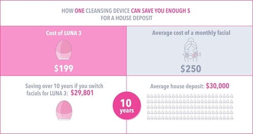 Ținând cont de toate acestea, doar LUNA 3 îți va economisi 134.721 Lei în zece ani dacă înlocuiești tratamentele faciale lunare scumpe cu acest dispozitiv inteligent – această economisire uriașă îți poate oferi un avans pentru o casă. De asemenea, îți elimină ora (sau mai mult) petrecută la salon (plus naveta) în fiecare lună într-un minut gestionabil pe zi, oferindu-ți o piele frumoasă din confortul propriei case și la o fracțiune din cost.