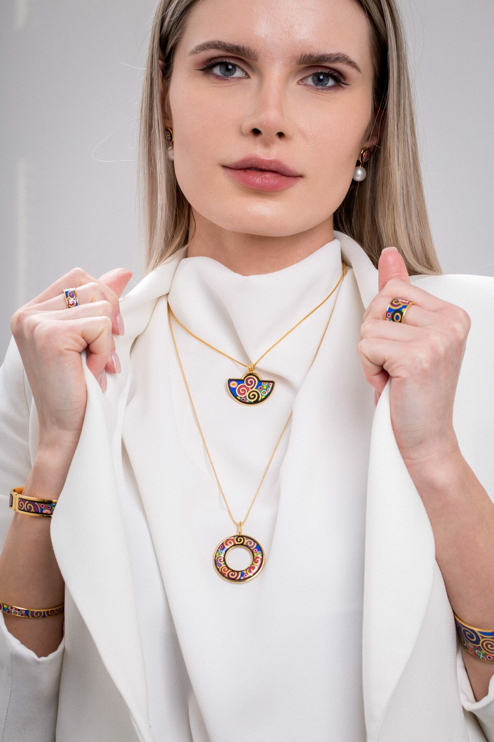 Inspirată de spiralele existente pe țesătură, artiștii noștri au ales să le reprezinte proeminent pe suprafețele de email strălucitor.