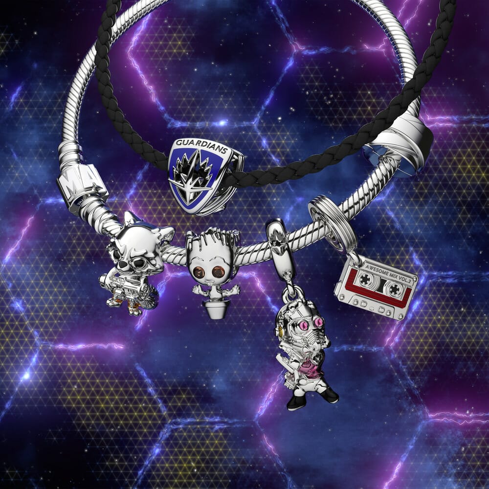Pentru a aduce Gardienii Galaxiei la viață. Star-Lord, Groot și Rocket sunt surprinși în talismane din argint 925, finisate manual, cu detalii emblematice, gravate cu citate ale personajelor. Mișcările de dans caracteristice ale lui Groot prind viață prin funcționalitatea mobilă din corpul talismanului. Caseta cu muzică a Star-Lord-ului este transformată într-un talisman cu detalii din email lucios. Angajamentul de a păstra autenticitatea personajului, combinată cu exigența tehnicilor Pandora, creează piese pe care fanii le vor recunoaște și vor dori să le adauge colecției Marvel x Pandora.