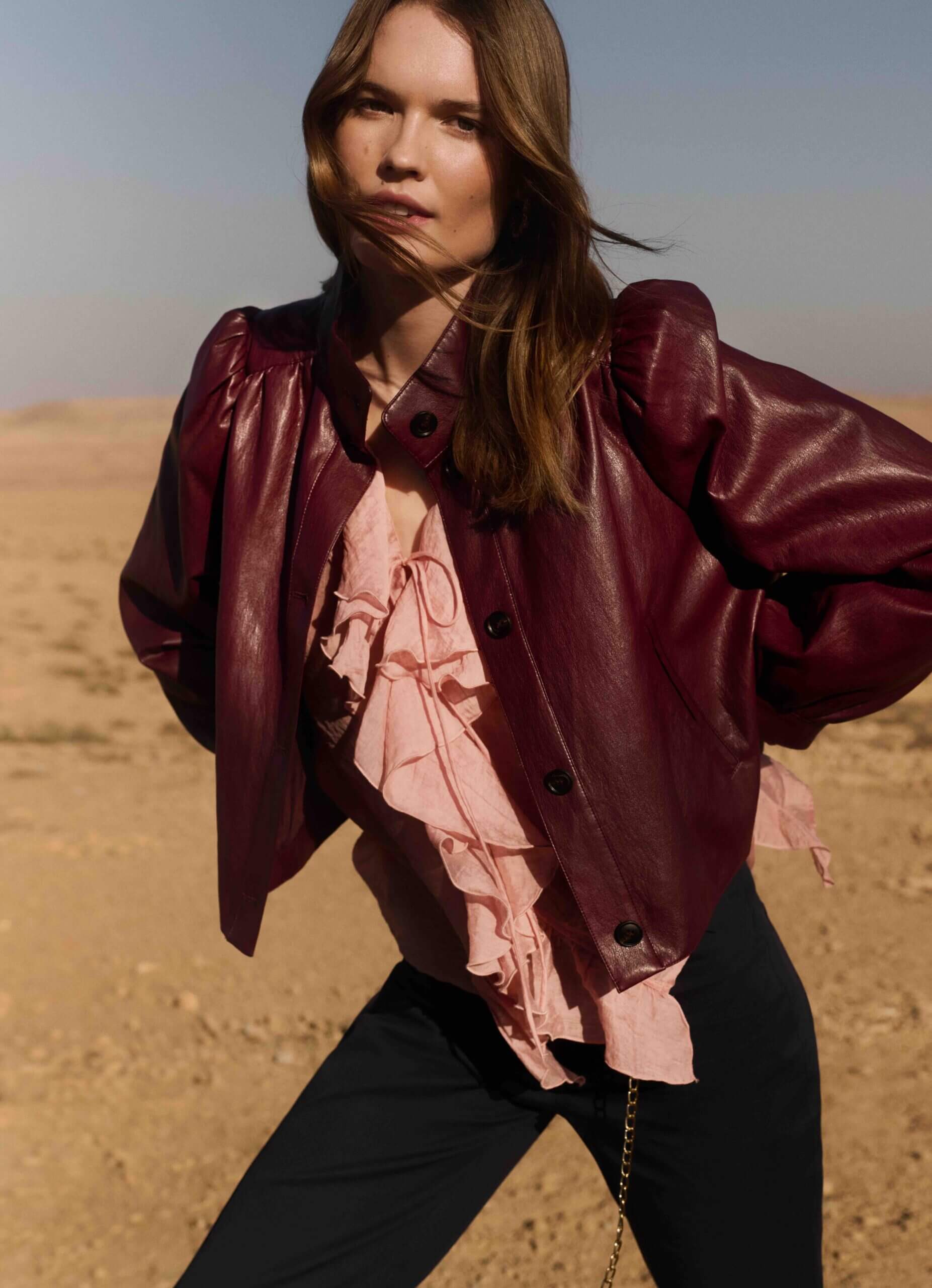 Pentru zilele de primăvară instabile, colecția integrează straturi exterioare gândite inteligent: jachete din denim cu guler contrastant marinăresc, bomber din piele maro sau jachete imitație de piele întoarsă. Acestea asigură atât confort termic, cât și coerență stilistică în ansamblu.