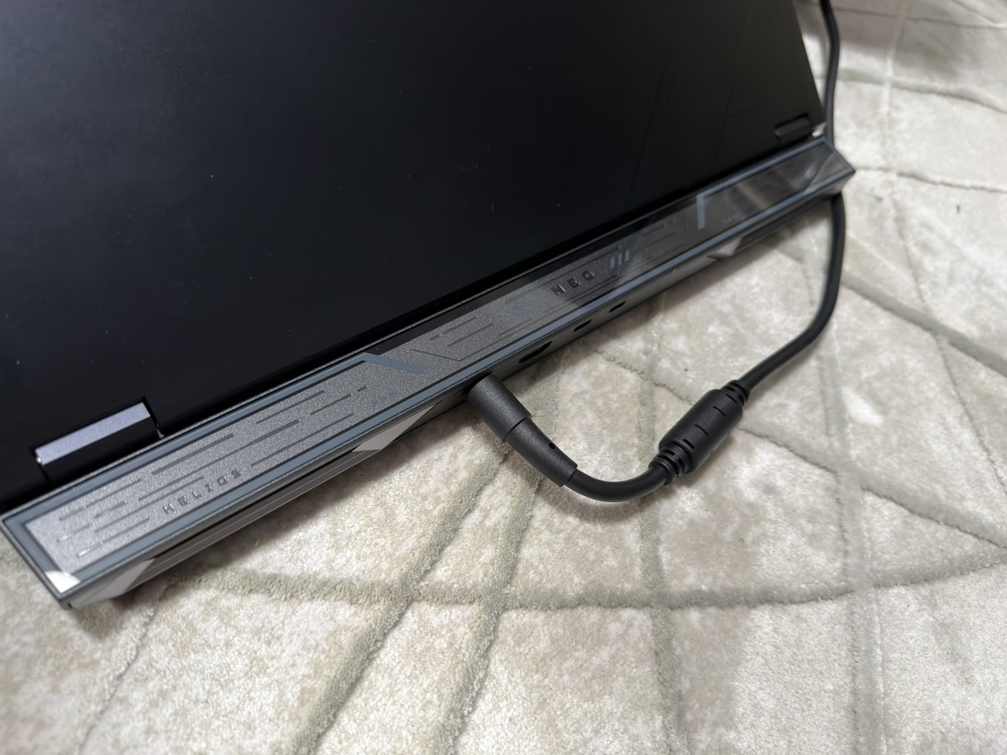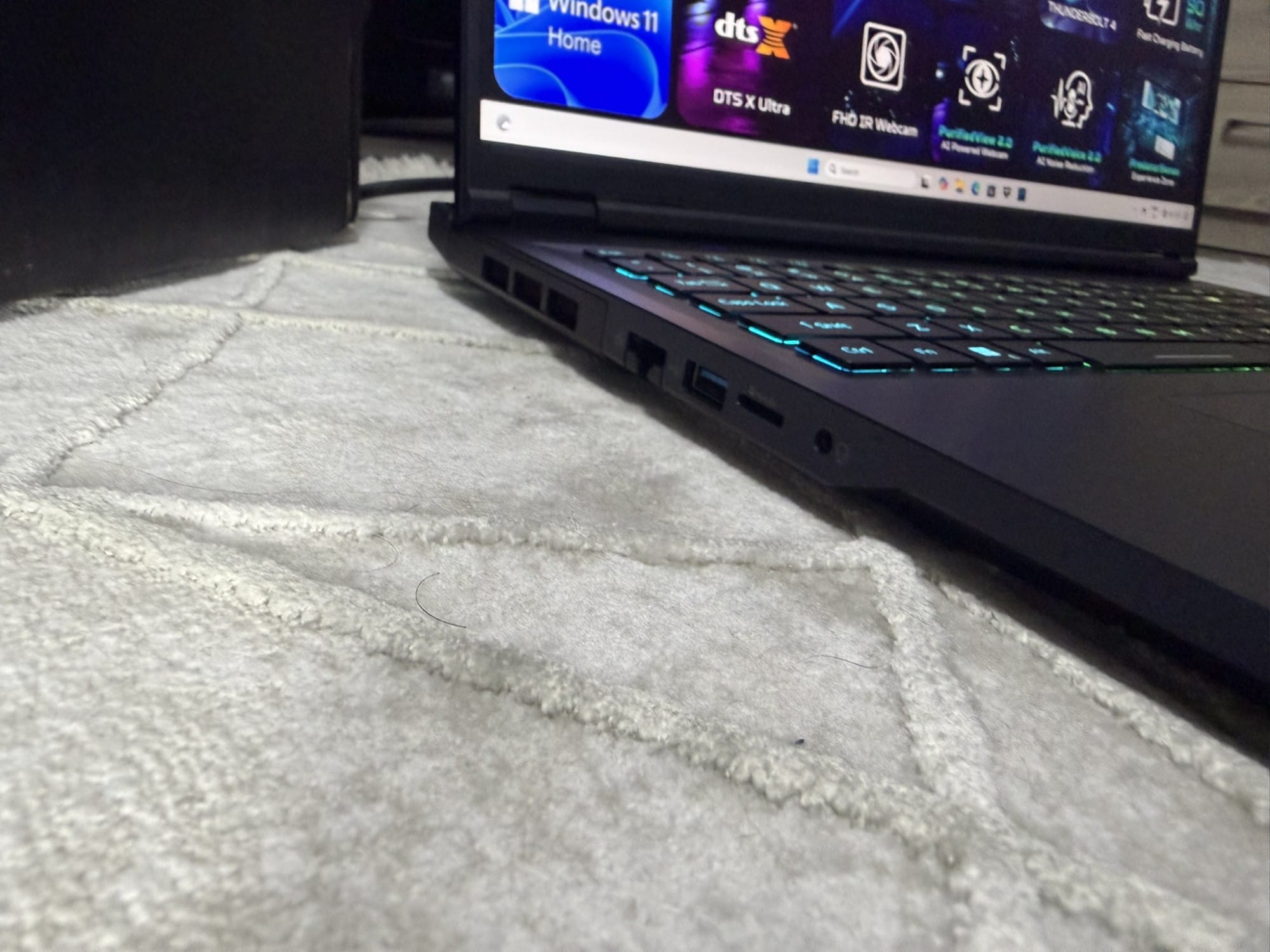 Zona de răcire este amplasată în partea din spate și pe laterale, cu fante mari care permit un flux de aer eficient. Iluminarea RGB este prezentă, dar nu deranjează — suficient cât să ofere acel aspect specific laptopurilor de gaming, fără să devină exagerată.