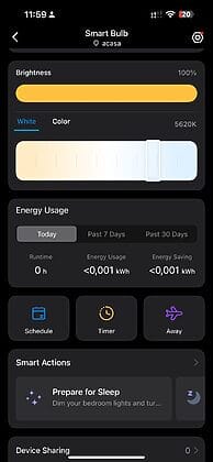 Aplicația TP-Link Tapo, disponibilă pentru Android și iOS și este perfectă pentru a utiliza funcțiile smart disponibile ale becului printre care schimbarea culorilor, stingerea sau arpinderea becului. Există și diferite funcții de a seta becul să se aprindă sau să se stingă la anumite ore, fiind o funcție perfectă dacă ești plecat de acasă, dar totuși vrei să lași impresia că este cineva.