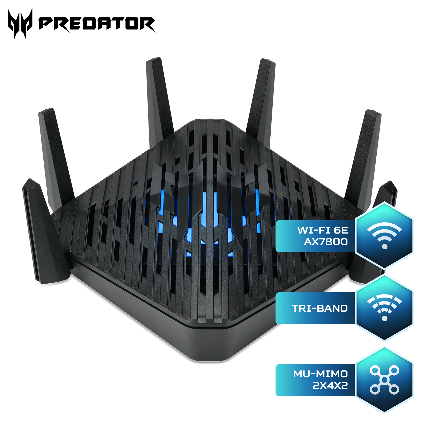 Cu 6 antene MU-MIMO calibrate pentru înaltă performanță și leduri RGB de stare pentru fiecare antenă, conectivitate Wi-Fi 6E 802.11 a/b/g/n/ac/ax Tri-band pe frecvențele de 2.4, 5 și 6 GHz cu vârfuri de până la 7,8 Gbps, capabilități Hybrid QoS compatibile cu Intel Killer Prioritization Engine și cu Intelligent Device Recognition, Acer Predator Connect W6 este mai mult decât pregătit să ofere fără efort rezultate de top în cele mai solicitante medii de lucru sau gaming.