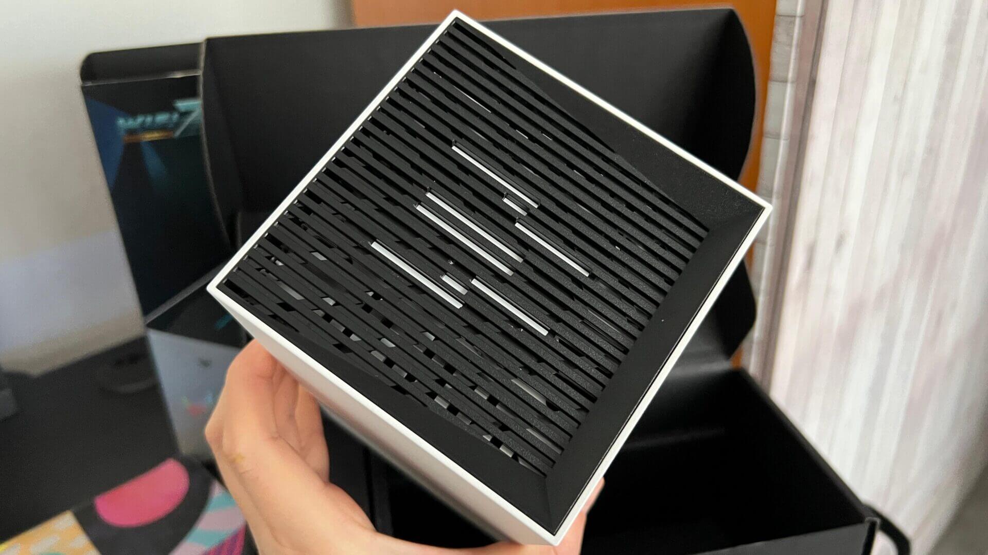 Forma dreptunghiulară și faptul că este poziționat pe verticală îți oferă impresia că este o altă consolă de gaming și se camuflează foarte bine între o consolă Xbox Series X și un PlayStation 5 sau PlayStation 5 Pro.