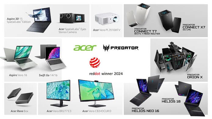 Dispozitivele Acer și Predator au fost distinse anul acesta cu paisprezece premii Red Dot pentru inovație în designul de produs. Brandul Predator a obținut numeroase premii cu laptopurile sale de gaming de înaltă performanță, routerele avansate Wi-Fi 7 și 5G și desktop-ul Predator Orion X, ușor de utilizat. Linia ecologică Vero de la Acer continuă să impresioneze experții globali în design, obținând recunoaștere pentru laptopul Aspire Vero 16, neutru din punct de vedere al emisiilor de carbon, pentru două monitoare și proiectorul inteligent Vero PL3510ATV fără mercur.