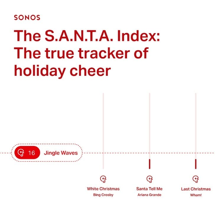 Indexul Sonos S.A.N.T.A. va analiza frecvența cu care utilizatorii caută și redau cele mai populare cinci melodii și filme de sărbători în aplicația Sonos din fiecare țară participantă – din Statele Unite, Canada și Mexic, până în România, Marea Britanie, Olanda, Africa de Sud, Columbia, Australia și altele. Combinând o serie de parametri, indicele va genera un scor Jingle Wave zilnic, pe o scară de la 0 (nicio bucurie de sărbători) la 100 (bucurie maximă de sărbători). Începutul oficial al sezonului de sărbători va fi marcat odată ce Jingle Waves vor atinge indicele de 50, în fiecare țară.