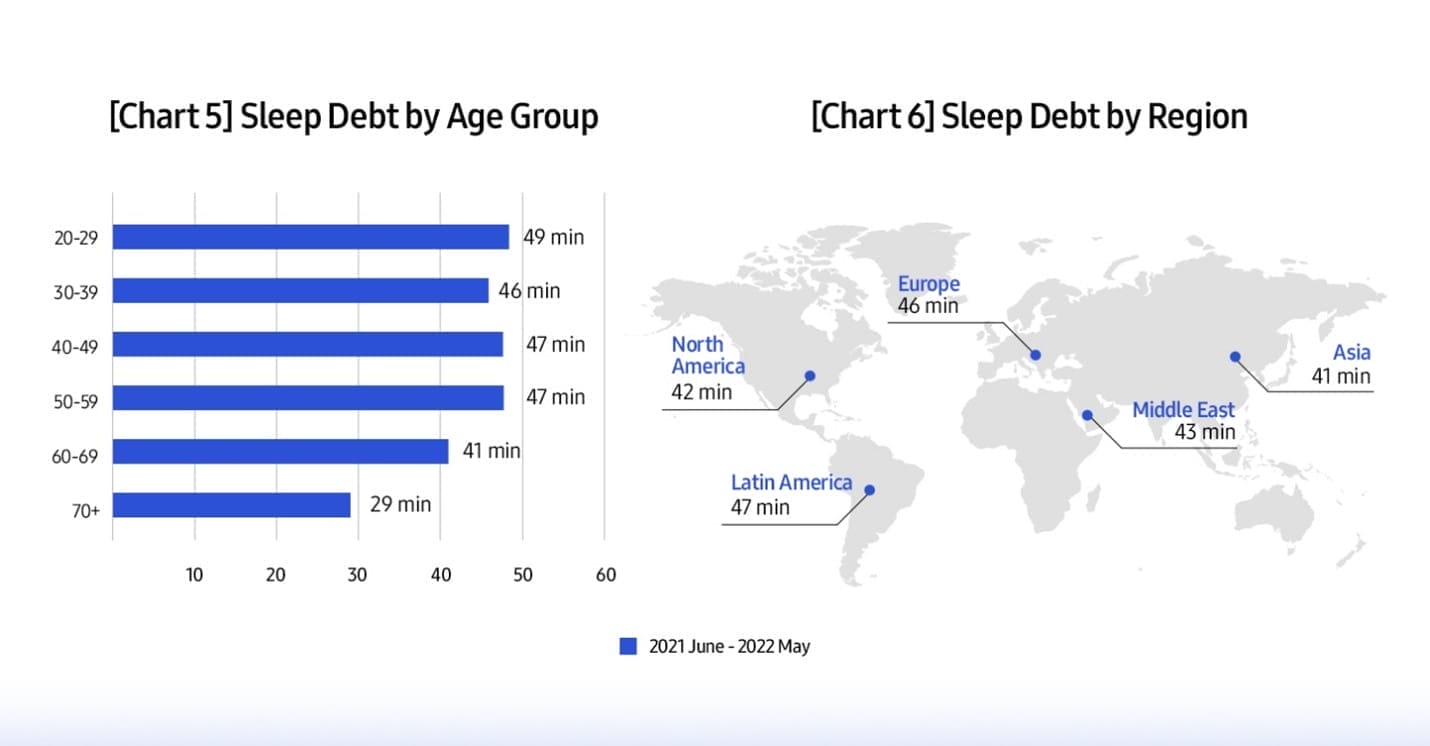Datoria de somn este cea mai mare în rândul tinerilor – cei din grupa de vârstă de 20 de ani aveau aproape dublul datoriei de somn comparativ cu cei din grupa de vârstă de 70 de ani: 49 de minute față de 29 de minute, respectiv. (Graficul 5) Din punct de vedere regional, Asia are cea mai mică datorie de somn, de 41 de minute, în timp ce America Latină înregistrează cea mai mare, de 47 de minute. La nivel global, oamenii dorm, în medie, cu 44 de minute în plus în weekend. (Graficul 6)