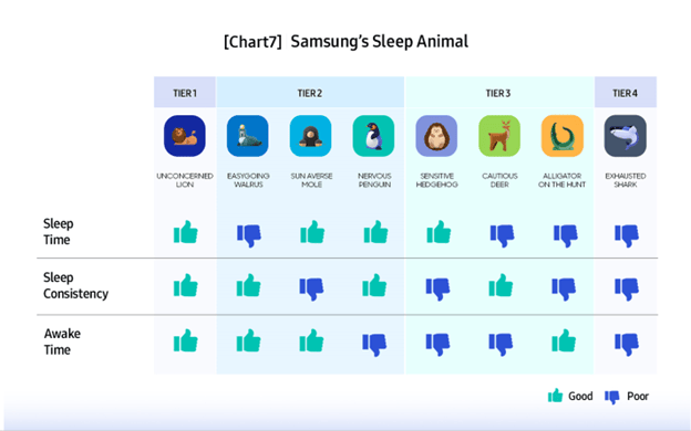 În efortul de a obține o înțelegere mai profundă a modelelor globale de somn prevalente, Samsung a încercat să analizeze și să categorizeze diferite tipuri de persoane care dorm în „Animale de Somn”. Fiecare dintre cele opt „Animale de Somn” reprezintă un model distinct de somn cu caracteristici unice legate de durata somnului, consistența acestuia și timpul petrecut în starea de veghe – toate acestea influențând colectiv calitatea somnului. (Graficul 7)