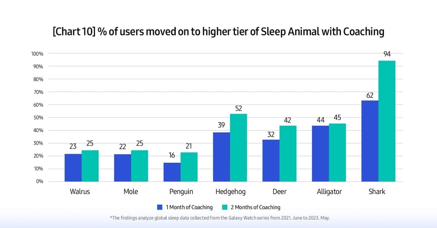 Pentru a examina eficacitatea programului de coaching pentru somn, Samsung a analizat câți utilizatori au avansat către un nivel superior al „Animalelor de Somn” cu ajutorul coachingului (Graficul 10). De exemplu, dacă un utilizator era „Aligatorul în vânătoare” la nivelul 3, se consideră că programul a avut succes atunci când acesta a avansat către un nivel superior al „Animalelor de Somn” la nivelul 1 sau 2. Când s-au analizat rezultatele, s-a constatat că programul chiar a funcționat. Un exemplu al eficacității coachingului pentru somn a rezultat din faptul că „Animalele de Somn” pot evolua în direcții pozitive cu obiceiuri mai bune de somn.