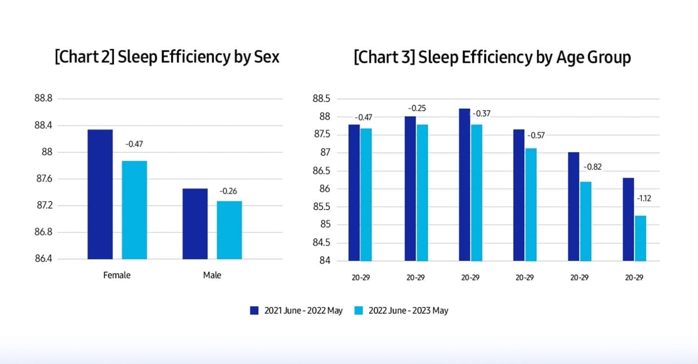 Un alt aspect îngrijorător este creșterea timpului petrecut în stare de veghe în timpul somnului, ceea ce duce la o scădere a eficienței somnului – un factor cheie în calitatea somnului, care este monitorizat prin calcularea raportului dintre timpul real petrecut în somn și timpul total petrecut în pat în fiecare noapte.