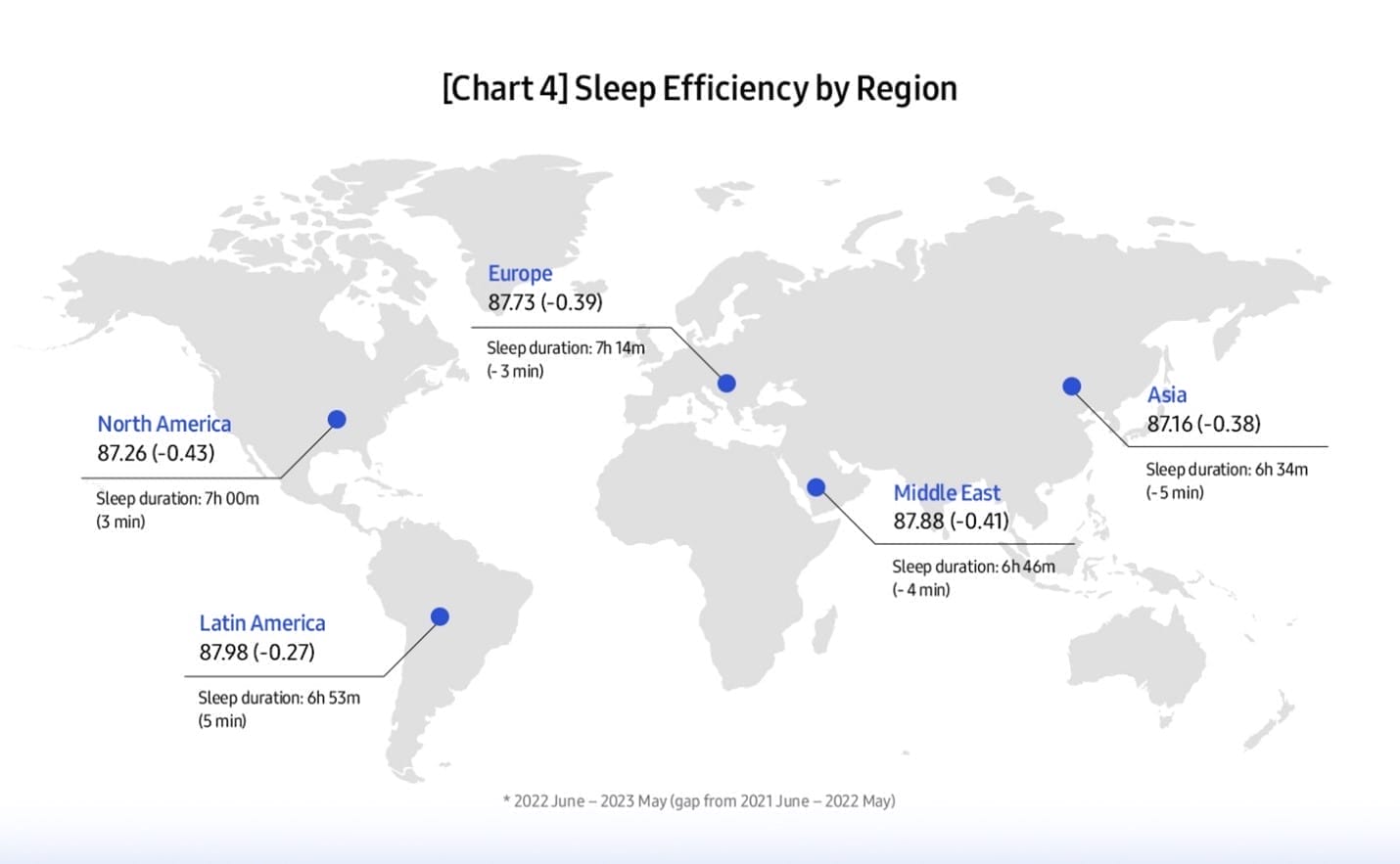 - America de Nord a înregistrat cea mai mare scădere a eficienței somnului. Asia a menținut cel mai scăzut nivel. (Graficul 4)