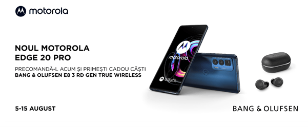 motorola edge 20 pro este disponibil începând de astăzi în România, la precomandă, în magazinele partenere Altex și eMAG, dar și online pe www.altex.ro și www.emag.ro , la prețul recomandat de 3.299 lei. În perioada 5-15 august, la achiziționarea oricărui telefon motorola edge 20 pro, primiți și o pereche de căști wireless BANG & OLUFSEN BeoPlay E8 3rd Gen, True Wireless.