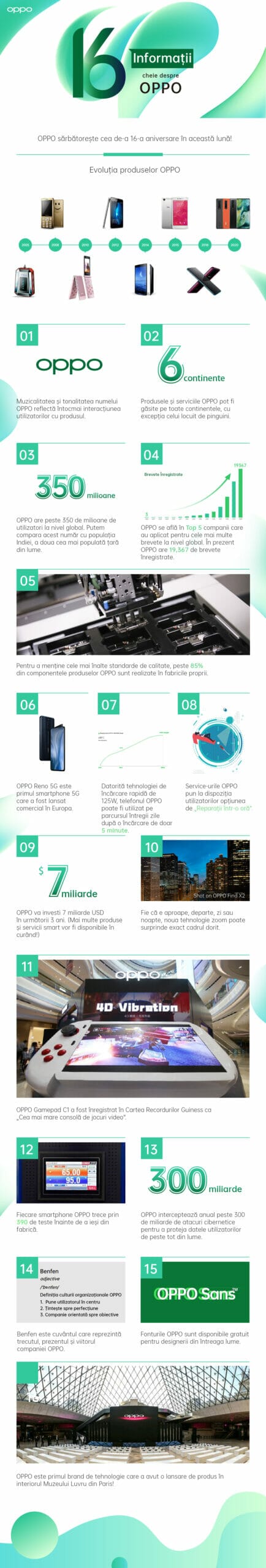 Brandul global de tehnologie OPPO sărbătorește cea de-a 16-a aniversare, care marchează un moment important în procesul continuu de inovație tehnologică și dezvoltare a companiei. În ultimii ani, OPPO s-a transformat dintr-un producător de telefoane, într-un inovator important în domeniul dispozitivelor inteligente. Compania continuă să își dezvolte extinderea globală, prin intermediul ofertei sale de produse premium, performante și cu un design contemporan, cât și a serviciilor oferite partenerilor și utilizatorilor săi, încercând, în același timp, să identifice noi moduri prin care să aducă inovația în industrie.