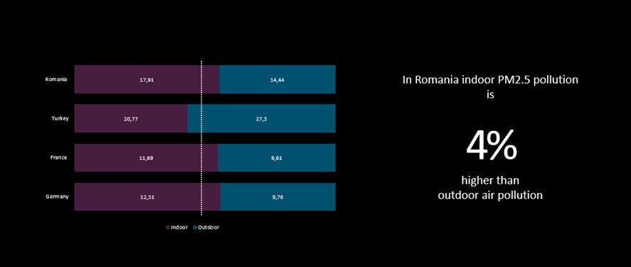 În majoritatea țărilor, poluarea aerului la interior este mai mare decât la exterior, arată analizele valorilor P.M2.5. În plus, expunerea la PM2.5 și la PM10 a fost asociată cu o serie de efecte adverse asupra sănătății. În cazul PM2.5, expunerile pe termen scurt (până la 24 de ore) au fost asociate cu mortalitate prematură, risc crescut de spitalizare din cauze cardiace sau pulmonare, bronșită acută și cronică, atacuri de astm, dificultăți respiratorii și perioade de inactivitate. Aceste efecte adverse asupra sănătății au fost raportate în principal la bebeluși, copii și adulți în vârstă cu boli cardiace sau pulmonare preexistente. În România, poluarea aerului este o problemă serioasă, iar autoritățile naționale și internaționale impun standarde din ce în ce mai stricte, pentru a reduce gradul de contaminare a aerului. În România, timp de zece luni pe an, poluarea aerului este mai mare la interior decât la exterior. Mai este luna în care nivelurile de poluare în spațiile interioare sunt cele mai ridicate, comparativ cu acelea ale poluării din spațiile exterioare. România este a șasea țară la nivel internațional care are o calitate slabă a aerului interior, peste norma anuală a Organizației Mondiale a Sănătății (OMS), depășind Franța, Germania și Marea Britanie. Turcia, care se află pe locul 3 în regiunea formată din Europa, Orientul Mijlociu și Africa, este țara cu cel mai slab nivel al calității aerului din interior.