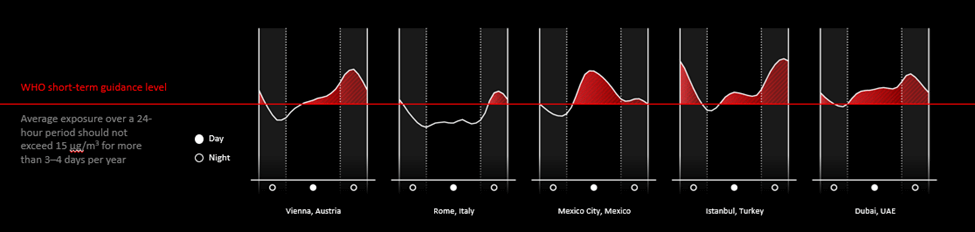 De-a lungul a 24 de ore, în mai multe zone geografice s-au înregistrat niveluri peste cele recomandate de OMS, timp de mai mult de jumătate de zi, în ceea ce privește PM2.5 (15 μg / m3). Printre țările respective se numără China, India, Coreea de Sud, Mexic, Emiratele Arabe Unite și Turcia. În orașe precum Berlin, Roma, Milano, Madrid, Polonia și România, oamenii au avut perioade într-o zi obișnuită în care expunerea la PM2,5 a depășit liniile directoare recomandate de Organizația Mondială a Sănătății (OMS). În mod similar, în orașe precum Shanghai, Beijing, Shenzhen, Delhi, Mumbai, Viena, Mexico City, Dubai și Istanbul, locuințele au depășit în mod constant recomandările OMS cu peste 50% într-o zi tipică pe parcursul anului 2022.
