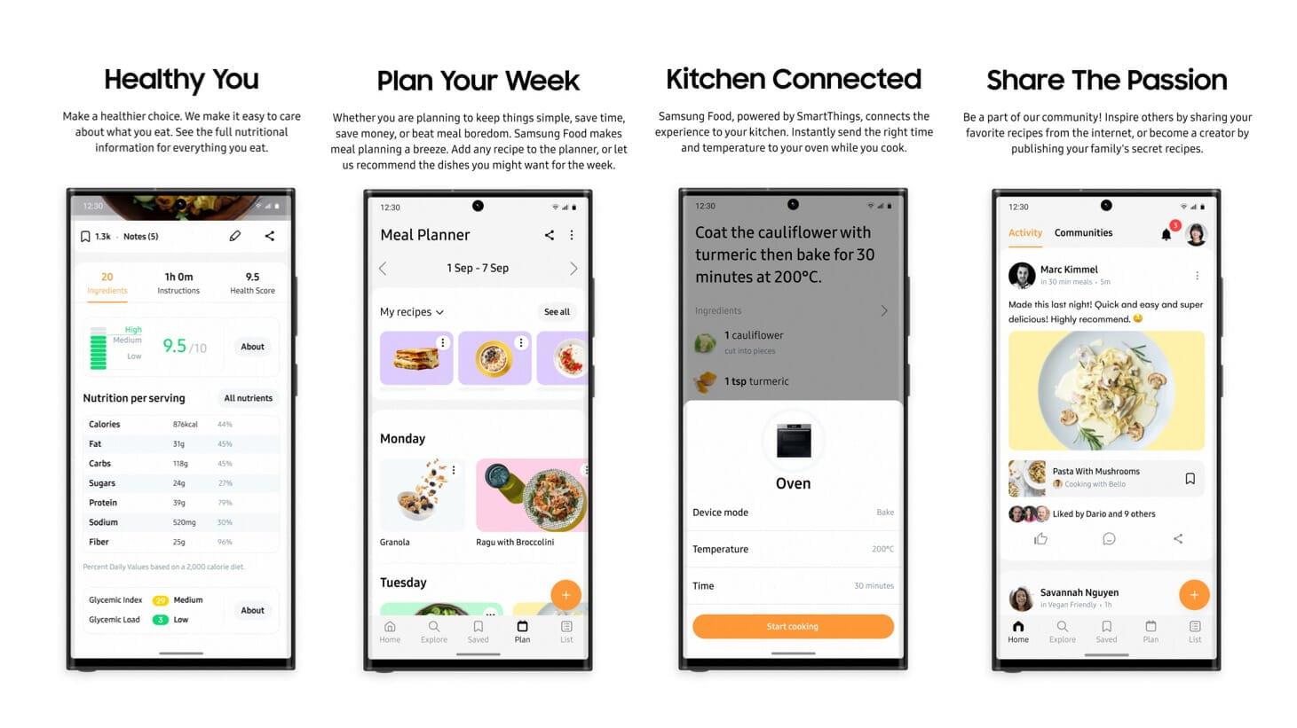 Pentru a crea planuri zilnice de mese individualizate pentru utilizatori, aplicația face recomandări create de AI pe baza datelor utilizatorilor, preferințelor alimentare și specificul culinar preferat, permitând utilizatorilor să le adauge la planificatorul lor de mese. Detaliile nutriționale ale ingredientelor sunt disponibile în orice moment, iar utilizatorii pot adăuga elemente la lista lor de cumpărături Samsung Food și apoi să o trimită direct in lista de cumparături a unui magazin online, la checkout-ul.