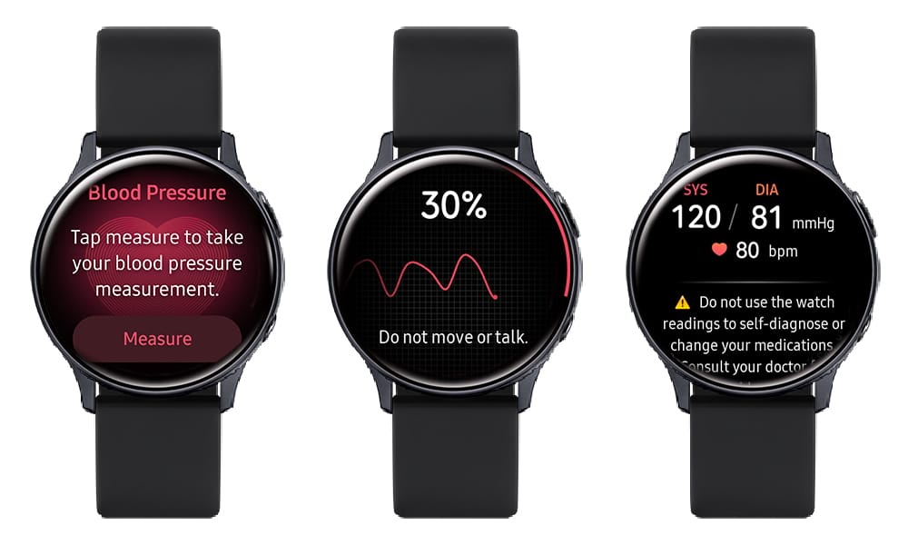 Odată ce Galaxy Watch3 sau Galaxy Watch Active2 sunt calibrate cu o manșetă[1] tradițională, utilizatorii pot „Măsura” tensiunea arterială oricând, oriunde cu doar o atingere. Dispozitivul măsoară tensiunea arterială prin analiza undelor pulsului, care sunt evaluate prin intermediul senzorilor de monitorizare a ritmului cardiac. Programul analizează apoi relația dintre valoarea de calibrare și modificarea tensiunii arteriale pentru a determina tensiunea arterială.