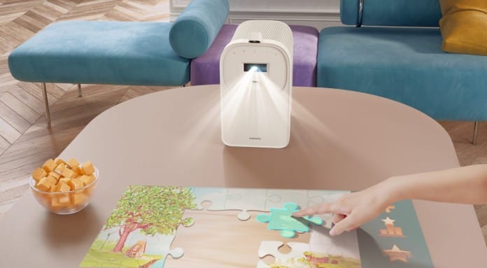 - Videoproiectorul integrează două camere cu tehnologie 3D Time-of-Flight pentru ajustarea automată a focalizării și corecția keystone, adaptând imaginea în timp real la forma și poziția suprafeței de proiecție.