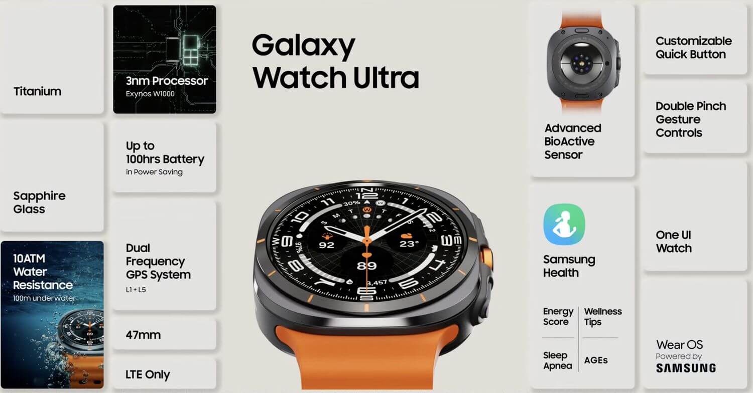 Bazându-se pe fundația funcțiilor avansate de monitorizare a sănătății și a hardware-ului robust al Galaxy Watch7, Galaxy Watch Ultra – cea mai nouă și mai puternică apariție în colecția Galaxy Watch – deblochează experiențe de fitness îmbunătățite pentru performanțe peste medie, cu inteligență și capacități de ultimă oră. Similar tradiției Galaxy Watch în materie de design circular, un nou design cu pernă îmbunătățește protecția și conferă vizibilitate completă, în timp ce sistemul Dynamic Lug pentru confort sporit permite utilizatorilor să fie cea mai bună versiune a lor oriunde și oricând.