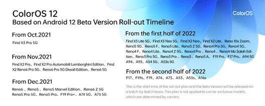 Prin această lansare, OPPO devine unul dintre primii producători de echipamente proprietare care dezvoltă un sistem de operare bazat pe Android 12. Noul ColorOS 12 va fi disponibil în primă fază pe smartphone-ul Find X3 Pro, în Indonezia, Thailanda și Malaysia, urmând ca până la finalul anului să-și extindă disponibilitatea și pentru alte modele și țări.