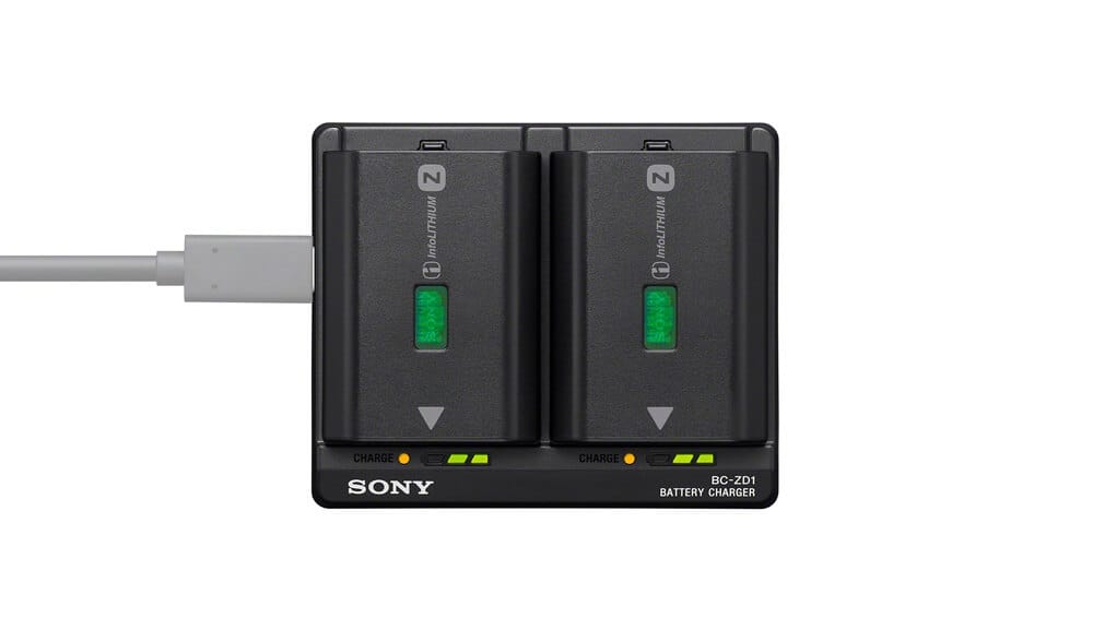 BC-ZD1 este un încărcător rapid pentru bateriile de mare capacitate NP-FZ100i de la Sony. Acesta poate încărca simultan două baterii în aproximativ 155 de minuteii (încărcare completăiii) atunci când este conectat la o sursă de alimentare compatibilă cu USB Power Delivery (PD) de 30W sau mai mult, și la un cablu USB PD (3A) sau un curent mai mare.