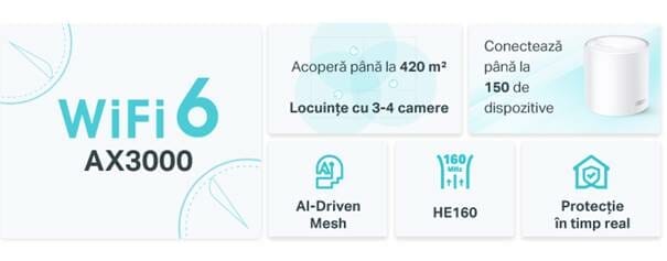 Sistemul Mesh ce deține tehnologia Wi-Fi 6 Dual-Band Gigabit este perfect pentru o locuință cu 3-4 camere și oferă acoperire wireless integrală de până la 420 m2 dacă utilizăm cele două unități. Și poate susține până la 150 de dispozitive simultan.