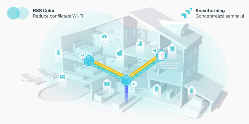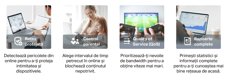 Iar pentru siguranța în mediul online TP-Link HomeShield detectează pericolele și le blochează. Pentru Wi-fi avem tehnologiile BSS Color și Beamforming ce reduc numărul de conflicte și sistemul este concentrat pe zonele esențiale.