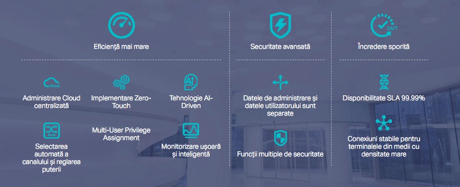 - algoritmii bazați pe inteligență artificială (AI-driven*), care asigură o performanță wireless de top, prin ajustarea automată a setărilor canalelor de transmisie și a nivelurilor de încărcare a access point-urilor (AP) din aceeași rețea. Aceștia analizează potențialele probleme de rețea, îi avertizează pe utilizatori cu privire la ele și oferă soluții personalizate relevante. Astfel, nu va mai fi nevoie să vă îngrijorați în legătură cu interferența semnalului Wi-Fi provenit de la diferite AP-uri și puteți preîntâmpina problemele de rețea într-un mod eficient.