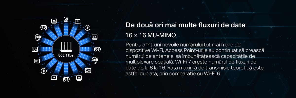 Performanța rețelei Wi-Fi 7 fiind completată de o serie de tehnologii avansate, precum 4096-QAM, Multi-RU și Multi-Link Operation care îi vor ajuta să navigheze pe Internet de 4.8 ori mai repede comparativ cu versiunea precedentă Wi-Fi 6, și de 13 ori mai rapid raportat la standardul Wi-Fi 5. Un avantaj major care se va resimți direct în experiența utilizatorilor este și throughput-ul cumulat de până la 46 Gbps, adică o capacitate de 5 ori mai mare prin comparație Wi-Fi 6.