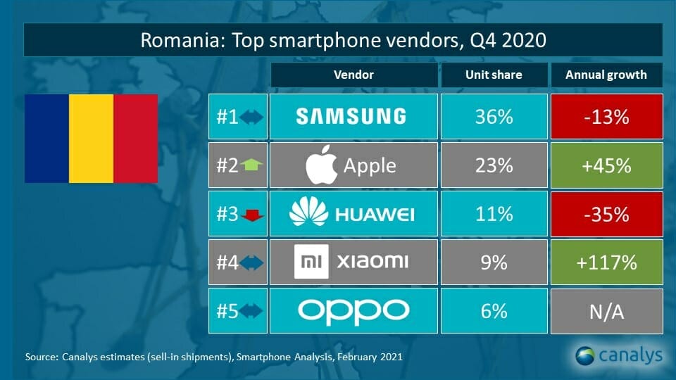 Potrivit Canalys, Xiaomi este pe locul 4 în topul producătorilor de telefoane inteligente de pe piața din România, cu o cotă de 9% a unităților livrate în ultimul trimestru din 2020 și cu o creștere anuală de 117%.